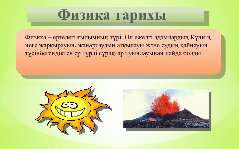 Физика – ертедегі ғылымның түрі. Ол ежелгі адамдардың Күннің неге жарқырауын, жанартаудың атқылауы және судың қайнауын түсінбегендіктен әр түрлі сұрақтар туындауынан пайда болды.