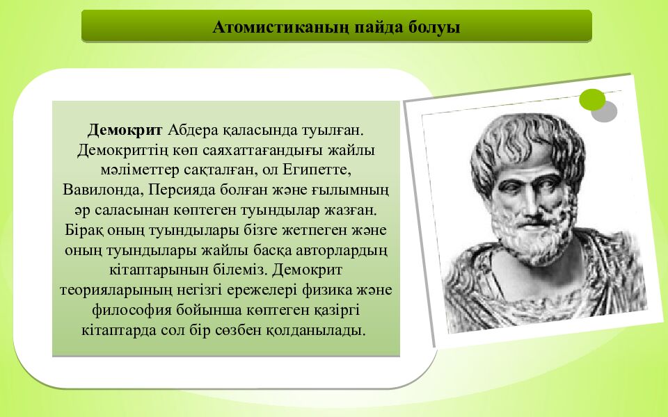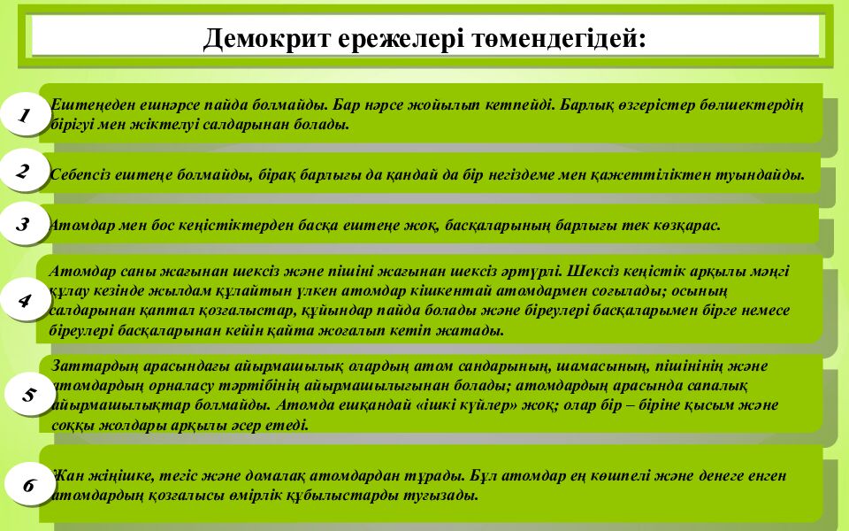 Демокрит ережелері төмендегідей: Ештеңеден ешнәрсе пайда болмайды. Бар нәрсе жойылып кетпейді. Барлық өзгерістер бөлшектердің бірігуі мен жіктелуі салдарынан болады. Себепсіз ештеңе болмайды, бірақ барлығы да қандай да бір негіздеме мен қажеттіліктен туындайды. Атомдар мен бос кеңістіктерден басқа ештеңе жоқ, басқаларының барлығы тек көзқарас. Атомдар саны жағынан шексіз және пішіні жағынан шексіз әртүрлі. Шексіз кеңістік арқылы мәңгі құлау кезінде жылдам құлайтын үлкен атомдар кішкентай атомдармен соғылады; осының салдарынан қаптал қозғалыстар, құйындар пайда болады және біреулері басқаларымен бірге немесе біреулері басқаларынан кейін қайта жоғалып кетіп жатады. Заттардың арасындағы айырмашылық олардың атом сандарының, шамасының, пішінінің және атомдардың орналасу тәртібінің айырмашылығынан болады; атомдардың арасында сапалық айырмашылықтар болмайды. Атомда ешқандай «ішкі күйлер» жоқ; олар бір – біріне қысым және соққы жолдары арқылы әсер етеді. Жан жіңішке, тегіс және домалақ атомдардан тұрады. Бұл атомдар ең көшпелі және денеге енген атомдардың қозғалысы өмірлік құбылыстарды туғызады. 1 2 3 4 5 6