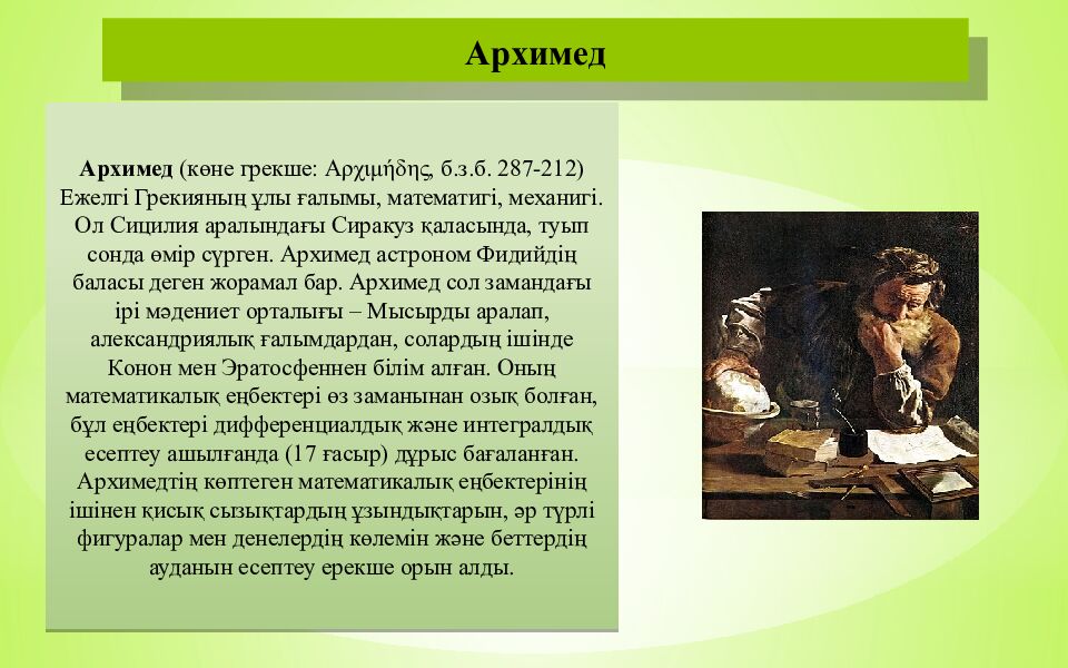 Архимед Архимед ( көне грекше : Αρχιμήδης, б.з.б. 287-212) Ежелгі Грекияның ұлы ғалымы, математигі, механигі. Ол Сицилия аралындағы Сиракуз қаласында, туып сонда өмір сүрген. Архимед астроном Фидийдің баласы деген жорамал бар. Архимед сол замандағы ірі мәдениет орталығы – Мысырды аралап, александриялық ғалымдардан, солардың ішінде Конон мен Эратосфеннен білім алған. Оның математикалық еңбектері өз заманынан озық болған, бұл еңбектері дифференциалдық және интегралдық есептеу ашылғанда (17 ғасыр ) дұрыс бағаланған. Архимедтің көптеген математикалық еңбектерінің ішінен қисық сызықтардың ұзындықтарын, әр түрлі фигуралар мен денелердің көлемін және беттердің ауданын есептеу ерекше орын алды.