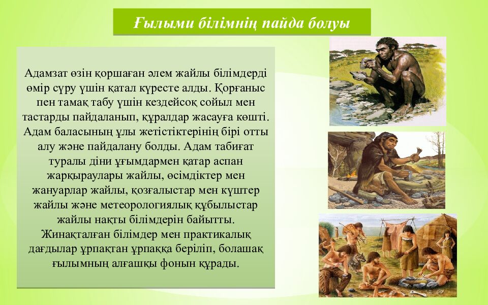 Ғылыми білімнің пайда болуы Адамзат өзін қоршаған әлем жайлы білімдерді өмір сүру үшін қатал күресте алды. Қорғаныс пен тамақ табу үшін кездейсоқ сойыл мен тастарды пайдаланып, құралдар жасауға көшті. Адам баласының ұлы жетістіктерінің бірі отты алу және пайдалану болды. Адам табиғат туралы діни ұғымдармен қатар аспан жарқыраулары жайлы, өсімдіктер мен жануарлар жайлы, қозғалыстар мен күштер жайлы және метеорологиялық құбылыстар жайлы нақты білімдерін байытты. Жинақталған білімдер мен практикалық дағдылар ұрпақтан ұрпаққа беріліп, болашақ ғылымның алғашқы фонын құрады.