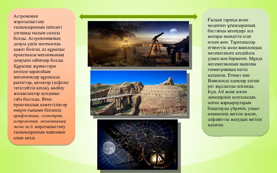 Астрономия жаратылыстану ғылымдарының ішіндегі алғашқы ғылым саласы болды. Астрономияның дамуы үшін математика қажет болған, ал құрылыс практикасы механиканың дамуына себепкер болды. Құрылыс жұмыстары кезінде қарапайым механизмдер құрамасы: рычагтар, катоктар (асфальт тегістейтін каток), көлбеу жазықтықтар қолданыс таба бастады. Яғни практикалық қажеттіліктер өмірге ғылыми білімнің: арифметика, геометрия, астрономия, механиканың және т.б. жаратылыстану ғылымдарының нышанын алып келді. Ғылым тарихы және мәдениет ұғымдарының бастапқы кезеңдері аса жоғары екендігін атап өткен жөн. Тарихшылар египеттік және вавилондық математикаға кездейсоқ үлкен мән бермеген. Мұнда математиканың нышаны геометрияның негізі қаланған. Египет пен Вавилонда адамдар алғаш рет жұлдызды аспанды, Күн, Ай және аспан денелерінің қозғалысын, аспан жарқырауларын бақылауды үйреніп, уақыт өлшемінің негізін жасап, алфавиттік жазудың негізін қалаған.
