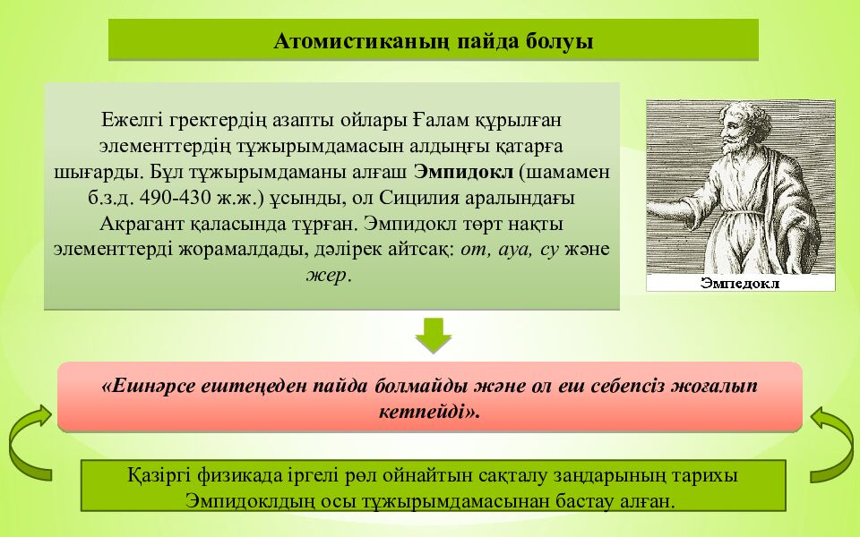 Атомистиканың пайда болуы Ежелгі гректердің азапты ойлары Ғалам құрылған элементтердің тұжырымдамасын алдыңғы қатарға шығарды. Бұл тұжырымдаманы алғаш Эмпидокл (шамамен б.з.д. 490-430 ж.ж.) ұсынды, ол Сицилия аралындағы Акрагант қаласында тұрған. Эмпидокл төрт нақты элементтерді жорамалдады, дәлірек айтсақ: от, ауа, су және жер. «Ешнәрсе ештеңеден пайда болмайды және ол еш себепсіз жоғалып кетпейді». Қазіргі физикада іргелі рөл ойнайтын сақталу заңдарының тарихы Эмпидоклдың осы тұжырымдамасынан бастау алған.