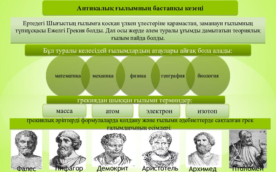 Ертедегі Шығыстың ғылымға қосқан үлкен үлестеріне қарамастан, заманауи ғылымның түпнұсқасы Ежелгі Грекия болды. Дәл осы жерде әлем туралы ұғымды дамытатын теориялық ғылым пайда болды. Антикалық ғылымның бастапқы кезеңі Бұл туралы келесідей ғылымдардың атаулары айғақ бола алады: грекиядан шыққан ғылыми терминдер: масса атом электрон изотоп грекиялық әріптерді формулаларда қолдану және ғылыми әдебиеттерде сақталған грек ғалымдарының есімдері: Фалес Пифагор Демокрит Аристотель Архимед Птоломей