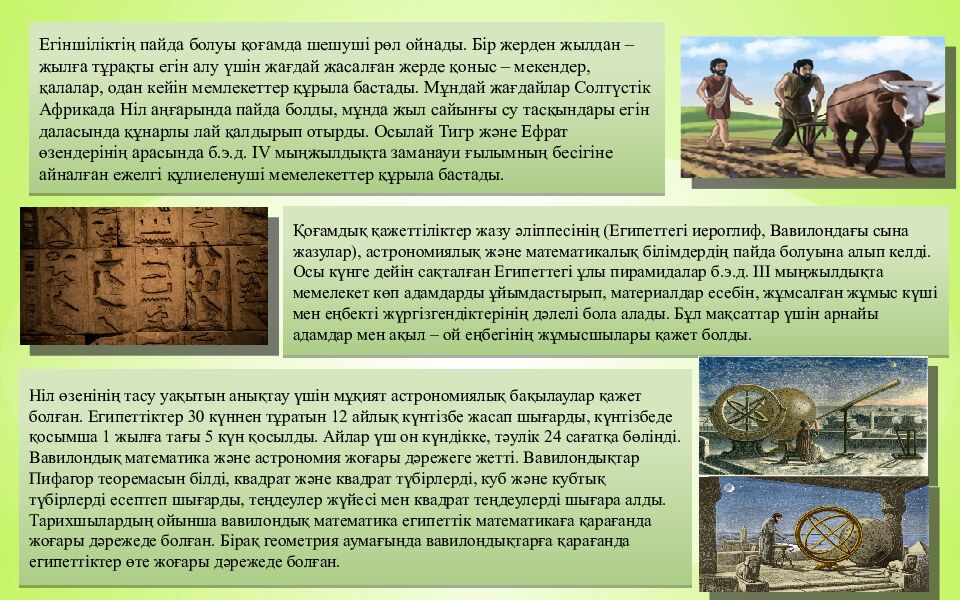Егіншіліктің пайда болуы қоғамда шешуші рөл ойнады. Бір жерден жылдан – жылға тұрақты егін алу үшін жағдай жасалған жерде қоныс – мекендер, қалалар, одан кейін мемлекеттер құрыла бастады. Мұндай жағдайлар Солтүстік Африкада Ніл аңғарында пайда болды, мұнда жыл сайынғы су тасқындары егін даласында құнарлы лай қалдырып отырды. Осылай Тигр және Ефрат өзендерінің арасында б.э.д. IV мыңжылдықта заманауи ғылымның бесігіне айналған ежелгі құлиеленуші мемелекеттер құрыла бастады. Қоғамдық қажеттіліктер жазу әліппесінің (Египеттегі иероглиф, Вавилондағы сына жазулар), астрономиялық және математикалық білімдердің пайда болуына алып келді. Осы күнге дейін сақталған Египеттегі ұлы пирамидалар б.э.д. III мыңжылдықта мемелекет көп адамдарды ұйымдастырып, материалдар есебін, жұмсалған жұмыс күші мен еңбекті жүргізгендіктерінің дәлелі бола алады. Бұл мақсаттар үшін арнайы адамдар мен ақыл – ой еңбегінің жұмысшылары қажет болды. Ніл өзенінің тасу уақытын анықтау үшін мұқият астрономиялық бақылаулар қажет болған. Египеттіктер 30 күннен тұратын 12 айлық күнтізбе жасап шығарды, күнтізбеде қосымша 1 жылға тағы 5 күн қосылды. Айлар үш он күндікке, тәулік 24 сағатқа бөлінді. Вавилондық математика және астрономия жоғары дәрежеге жетті. Вавилондықтар Пифагор теоремасын білді, квадрат және квадрат түбірлерді, куб және кубтық түбірлерді есептеп шығарды, теңдеулер жүйесі мен квадрат теңдеулерді шығара алды. Тарихшылардың ойынша вавилондық математика египеттік математикаға қарағанда жоғары дәрежеде болған. Бірақ геометрия аумағында вавилондықтарға қарағанда египеттіктер өте жоғары дәрежеде болған.