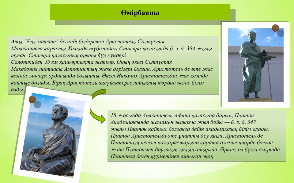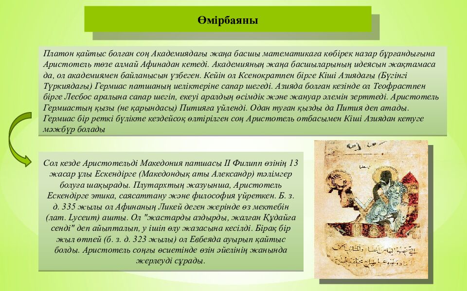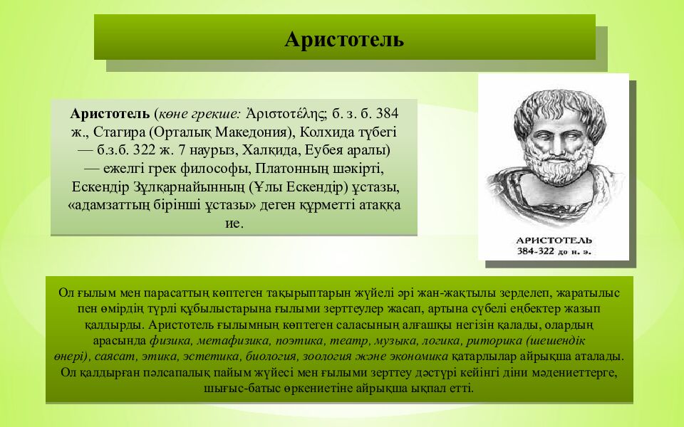 Аристотель Аристотель ( көне грекше : Ἀριστοτέλης; б. з. б. 384 ж., Стагира ( Орталық Македония), Колхида түбегі — б.з.б. 322 ж. 7 наурыз, Халқида, Еубея аралы ) — ежелгі грек философы, Платонның шәкірті, Ескендір Зұлқарнайынның (Ұлы Ескендір ) ұстазы, « адамзаттың бірінші ұстазы » деген құрметті атаққа ие. Ол ғылым мен парасаттың көптеген тақырыптарын жүйелі әрі жан-жақтылы зерделеп, жаратылыс пен өмірдің түрлі құбылыстарына ғылыми зерттеулер жасап, артына сүбелі еңбектер жазып қалдырды. Аристотель ғылымның көптеген саласының алғашқы негізін қалады, олардың арасында физика, метафизика, поэтика, театр, музыка, логика, риторика ( шешендік өнері ), саясат, этика, эстетика, биология, зоология және экономика қатарлылар айрықша аталады. Ол қалдырған пәлсапалық пайым жүйесі мен ғылыми зерттеу дәстүрі кейінгі діни мәдениеттерге, шығыс-батыс өркениетіне айрықша ықпал етті.