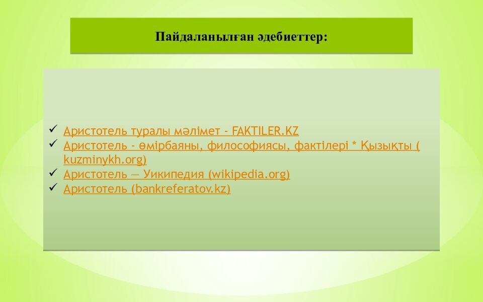 Пайдаланылған әдебиеттер: Аристотель туралы мәлімет - FAKTILER.KZ Аристотель - өмірбаяны, философиясы, фактілері * Қызықты ( kuzminykh.org ) Аристотель — Уикипедия ( wikipedia.org ) Аристотель ( bankreferatov.kz)