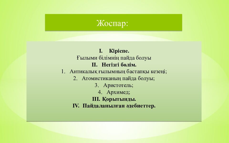 Кіріспе. Ғылыми білімнің пайда болуы Негізгі бөлім. Антикалық ғылымның бастапқы кезеңі; Атомистиканың пайда болуы; Аристотель; Архимед; Қорытынды. Пайдаланылған әдебиеттер. Жоспар: