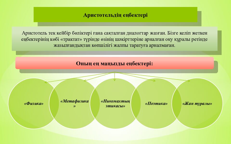 Аристотельдің еңбектері Аристотель тек кейбір бөліктері ғана сақталған диалогтар жазған. Бізге келіп жеткен еңбектерінің көбі «трактат» түрінде өзінің шәкірттеріне арналған оқу құралы ретінде жазылғандықтан көпшілігі жалпы таратуға арналмаған. Оның ең маңызды еңбектері :