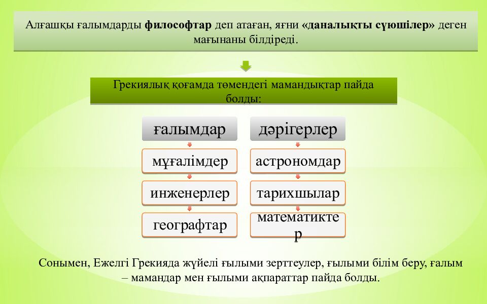 Алғашқы ғалымдарды философтар деп атаған, яғни «даналықты сүюшілер» деген мағынаны білдіреді. Грекиялық қоғамда төмендегі мамандықтар пайда болды: Сонымен, Ежелгі Грекияда жүйелі ғылыми зерттеулер, ғылыми білім беру, ғалым – мамандар мен ғылыми ақпараттар пайда болды.