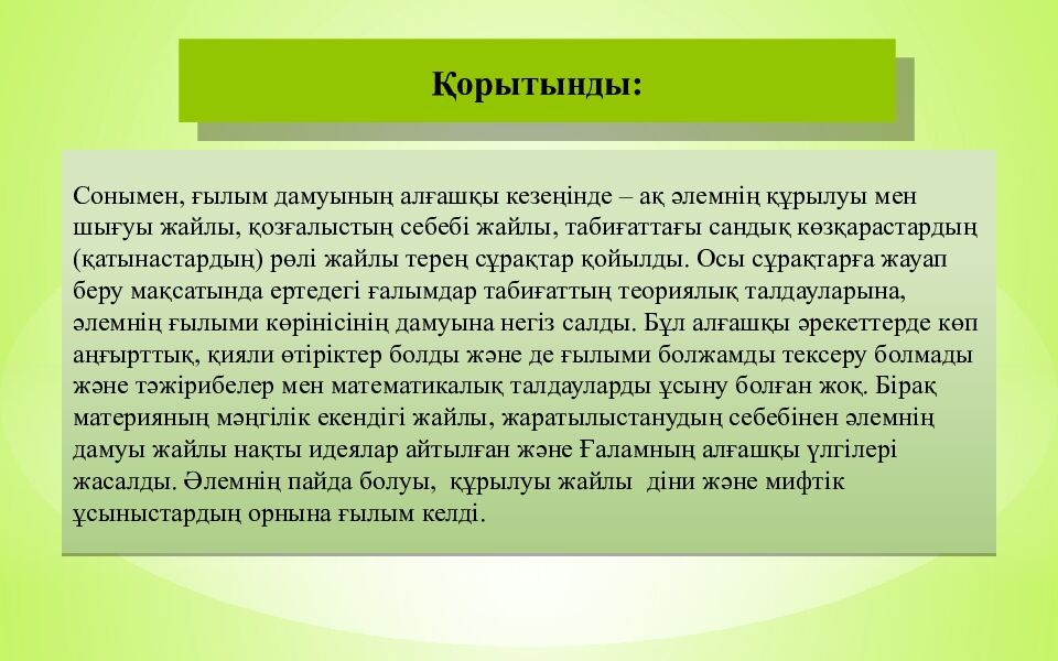 Қорытынды: Сонымен, ғылым дамуының алғашқы кезеңінде – ақ әлемнің құрылуы мен шығуы жайлы, қозғалыстың себебі жайлы, табиғаттағы сандық көзқарастардың (қатынастардың) рөлі жайлы терең сұрақтар қойылды. Осы сұрақтарға жауап беру мақсатында ертедегі ғалымдар табиғаттың теориялық талдауларына, әлемнің ғылыми көрінісінің дамуына негіз салды. Бұл алғашқы әрекеттерде көп аңғырттық, қияли өтіріктер болды және де ғылыми болжамды тексеру болмады және тәжірибелер мен математикалық талдауларды ұсыну болған жоқ. Бірақ материяның мәңгілік екендігі жайлы, жаратылыстанудың себебінен әлемнің дамуы жайлы нақты идеялар айтылған және Ғаламның алғашқы үлгілері жасалды. Әлемнің пайда болуы, құрылуы жайлы діни және мифтік ұсыныстардың орнына ғылым келді.