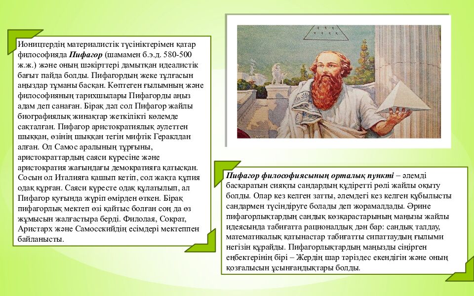 Иоництердің материалистік түсініктерімен қатар философияда Пифагор (шамамен б.э.д. 580-500 ж.ж.) және оның шәкірттері дамытқан идеалистік бағыт пайда болды. Пифагордың жеке тұлғасын аңыздар тұманы басқан. Көптеген ғылымның және философияның тарихшылары Пифагорды аңыз адам деп санаған. Бірақ дәл сол Пифагор жайлы биографиялық жинақтар жеткілікті көлемде сақталған. Пифагор аристократиялық әулеттен шыққан, өзінің шыққан тегін мифтік Гераклдан алған. Ол Самос аралының тұрғыны, аристократтардың саяси күресіне және аристократия жағындағы демократияға қатысқан. Сосын ол Италияға қашып кетіп, сол жақта құпия одақ құрған. Саяси күресте одақ құлатылып, ал Пифагор қуғында жүріп өмірден өткен. Бірақ пифагорлық мектеп өзі қайтыс болған соң да өз жұмысын жалғастыра берді. Филолая, Сократ, Аристарх және Самосскийдің есімдері мектеппен байланысты. Пифагор философиясының орталық пункті – әлемді басқаратын сияқты сандардың құдіретті рөлі жайлы оқыту болды. Олар кез келген затты, әлемдегі кез келген құбылысты сандармен түсіндіруге болады деп жорамалдады. Әрине пифагорлықтардың сандық көзқарастарының маңызы жайлы идеясында табиғатта рационалдық дән бар: сандық талдау, математикалық қатынастар табиғатты сипаттаудың ғылыми негізін құрайды. Пифагорлықтардың маңызды сіңірген еңбектерінің бірі – Жердің шар тәріздес екендігін және оның қозғалысын ұсынғандықтары болды.