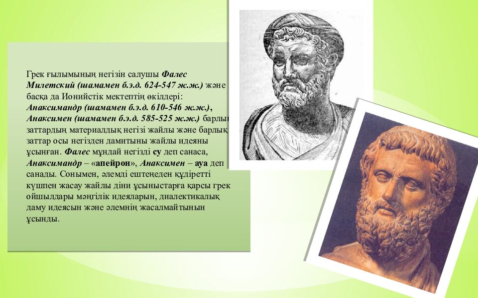 Грек ғылымының негізін салушы Фалес Милетский (шамамен б.э.д. 624-547 ж.ж.) және басқа да Ионийстік мектептің өкілдері: Анаксимандр (шамамен б.э.д. 610-546 ж.ж.), Анаксимен (шамамен б.э.д. 585-525 ж.ж.) барлық заттардың материалдық негізі жайлы және барлық заттар осы негізден дамитыны жайлы идеяны ұсынған. Фалес мұндай негізді су деп санаса, Анаксимандр – « апейрон », Анаксимен – ауа деп санады. Сонымен, әлемді ештеңеден құдіретті күшпен жасау жайлы діни ұсыныстарға қарсы грек ойшылдары мәңгілік идеяларын, диалектикалық даму идеясын және әлемнің жасалмайтынын ұсынды.