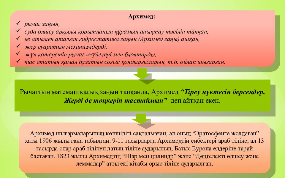 Архимед: рычаг заңын, суда өлшеу арқылы қорытпаның құрамын анықтау тәсілін тапқан, өз атымен аталған гидростатика заңын (Архимед заңы ) ашқан, жер суаратын механизмдерді, жүк көтеретін рычаг жүйелері мен блоктарды, тас ататын қамал бұзатын соғыс қондырғыларын, т.б. ойлап шығарған. Рычагтың математикалық заңын тапқанда, Архимед “ Тіреу нүктесін берсеңдер, Жерді де төңкеріп тастаймын ” деп айтқан екен. Архимед шығармаларының көпшілігі сақталмаған, ал оның “ Эратосфенге жолдаған ” хаты 1906 жылы ғана табылған. 9-11 ғасырларда Архимедтің еңбектері араб тіліне, ал 13 ғасырда олар араб тілінен латын тіліне аударылып, Батыс Еуропа елдеріне тарай бастаған. 1823 жылы Архимедтің “Шар мен цилиндр” және “ Дөңгелекті өлшеу және леммалар ” атты екі кітабы орыс тіліне аударылған.