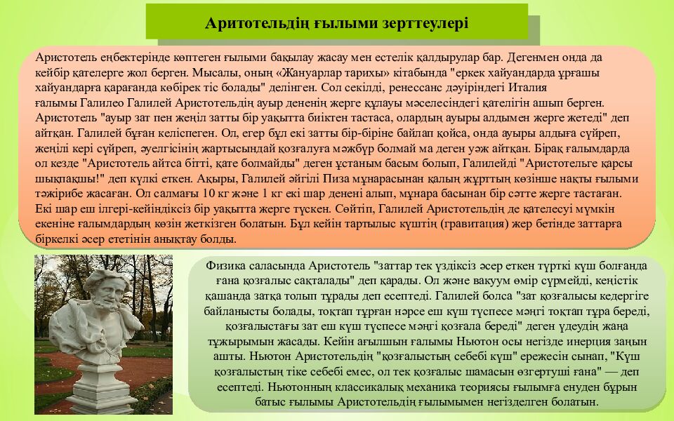 Аритотельдің ғылыми зерттеулері Физика саласында Аристотель " заттар тек үздіксіз әсер еткен түрткі күш болғанда ғана қозғалыс сақталады " деп қарады. Ол және вакуум өмір сүрмейді, кеңістік қашанда затқа толып тұрады деп есептеді. Галилей болса " зат қозғалысы кедергіге байланысты болады, тоқтап тұрған нәрсе еш күш түспесе мәңгі тоқтап тұра береді, қозғалыстағы зат еш күш түспесе мәңгі қозғала береді " деген үдеудің жаңа тұжырымын жасады. Кейін ағылшын ғалымы Ньютон осы негізде инерция заңын ашты. Ньютон Аристотельдің " қозғалыстың себебі күш " ережесін сынап, " Күш қозғалыстың тіке себебі емес, ол тек қозғалыс шамасын өзгертуші ғана" — деп есептеді. Ньютонның классикалық механика теориясы ғылымға енуден бұрын батыс ғылымы Аристотельдің ғылымымен негізделген болатын. Аристотель еңбектерінде көптеген ғылыми бақылау жасау мен естелік қалдырулар бар. Дегенмен онда да кейбір қателерге жол берген. Мысалы, оның « Жануарлар тарихы» кітабында " еркек хайуандарда ұрғашы хайуандарға қарағанда көбірек тіс болады" делінген. Сол секілді, ренессанс дәуіріндегі Италия ғалымы Галилео Галилей Аристотельдің ауыр дененің жерге құлауы мәселесіндегі қателігін ашып берген. Аристотель " ауыр зат пен жеңіл затты бір уақытта биіктен тастаса, олардың ауыры алдымен жерге жетеді " деп айтқан. Галилей бұған келіспеген. Ол, егер бұл екі затты бір- біріне байлап қойса, онда ауыры алдыға сүйреп, жеңілі кері сүйреп, әуелгісінің жартысындай қозғалуға мәжбүр болмай ма деген уәж айтқан. Бірақ ғалымдарда ол кезде "Аристотель айтса бітті, қате болмайды " деген ұстаным басым болып, Галилейді " Аристотельге қарсы шықпақшы !" деп күлкі еткен. Ақыры, Галилей әйгілі Пиза мұнарасынан қалың жұрттың көзінше нақты ғылыми тәжірибе жасаған. Ол салмағы 10 кг және 1 кг екі шар денені алып, мұнара басынан бір сәтте жерге тастаған. Екі шар еш ілгері-кейіндіксіз бір уақытта жерге түскен. Сөйтіп, Галилей Аристотельдің де қателесуі мүмкін екеніне ғалымдардың көзін жеткізген болатын. Бұл кейін тартылыс күштің (гравитация) жер бетінде заттарға біркелкі әсер ететінін анықтау болды.