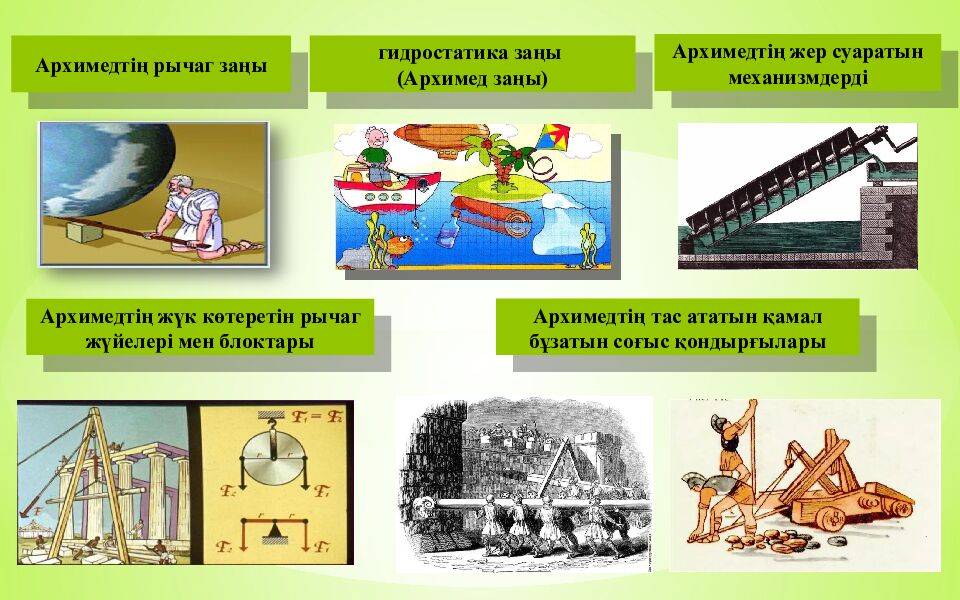 Архимедтің рычаг заңы гидростатика заңы ( Архимед заңы ) Архимедтің жүк көтеретін рычаг жүйелері мен блоктары Архимедтің жер суаратын механизмдерді Архимедтің тас ататын қамал бұзатын соғыс қондырғылары