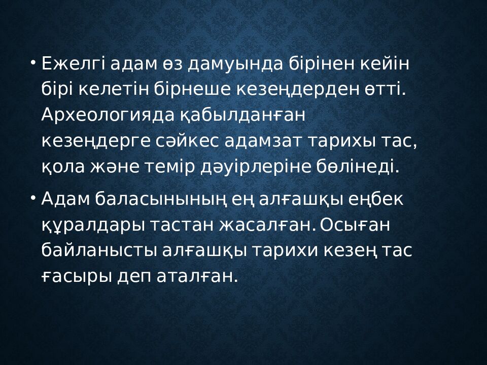 Ежелгі адам өз дамуында бірінен кейін бірі келетін бірнеше кезеңдерден өтті. Археологияда қабылданған кезеңдерге сәйкес адамзат тарихы тас, қола және темір дәуірлеріне бөлінеді. Адам баласынының ең алғашқы еңбек құралдары тастан жасалған. Осыған байланысты алғашқы тарихи кезең тас ғасыры деп аталған.