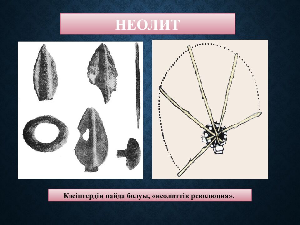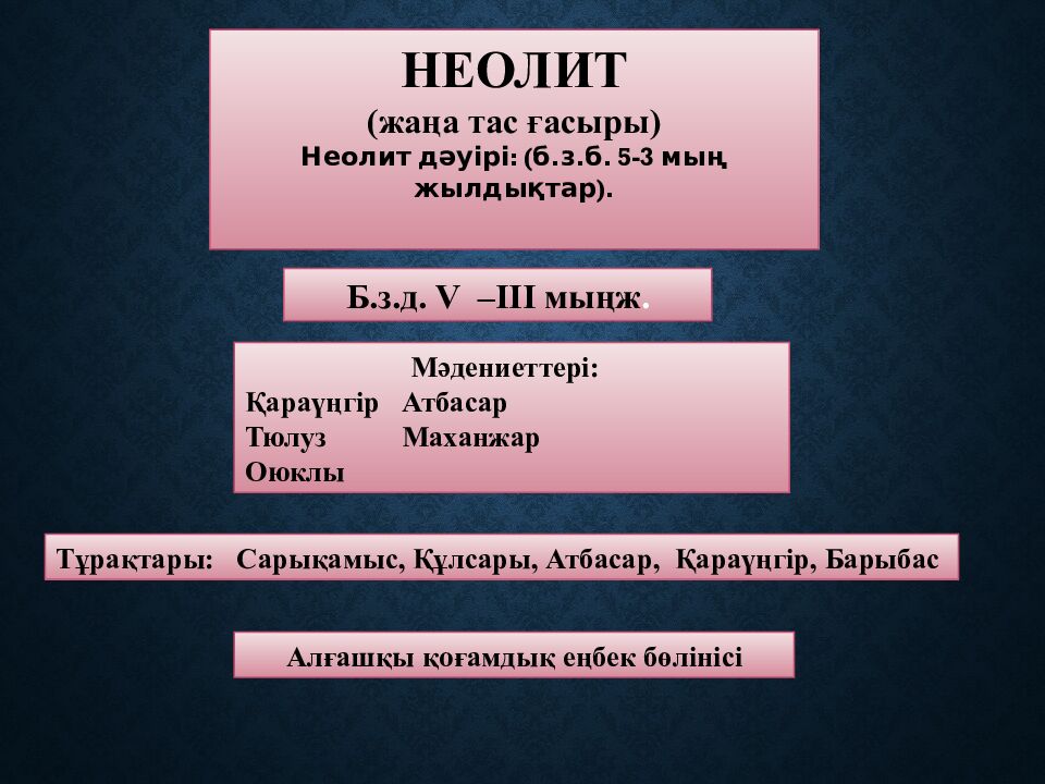 ПАЛЕОЛИТ (древний каменный век) НЕОЛИТ (жаңа тас ғасыры ) Неолит дәуірі : ( б.з.б. 5-3 мың жылдықтар ). Б.з.д. V – III мыңж. Мәдениеттері: Қараүңгір Атбасар Тюлуз Маханжар Оюклы Тұрақтары: Сарықамыс, Құлсары, Атбасар, Қараүңгір, Барыбас Алғашқы қоғамдық еңбек бөлінісі