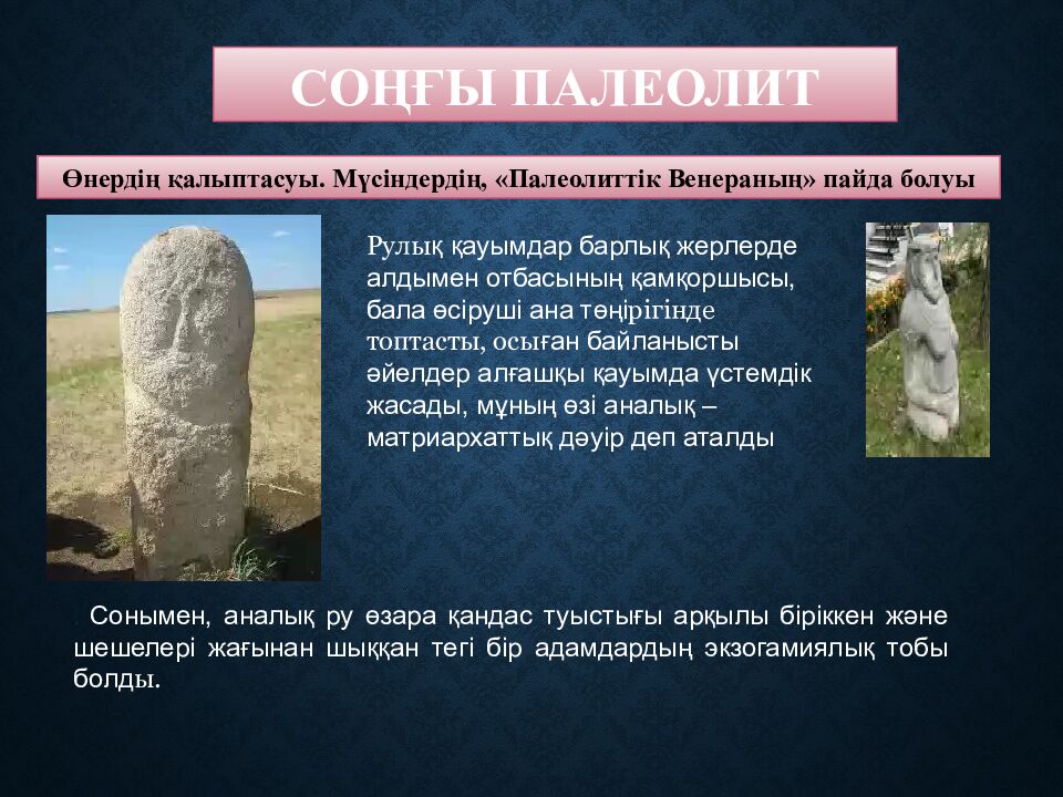 C ОҢ ҒЫ ПАЛЕОЛИТ Өнердің қ алыптасуы. Мүсіндердің, « Палеолиттік Венераның» пайда болуы . Сонымен, аналы қ ру ө зара қ андас туысты ғ ы ар қ ылы біріккен ж ә не шешелері жа ғ ынан шы ққ ан тегі бір адамдарды ң экзогамиялы қ тобы болд ы. Рулы қ қ ауымдар барлы қ жерлерде алдымен отбасыны ң қ ам қ оршысы, бала ө сіруші ана т өң і рігінде топтасты, осы ғ ан байланысты ә йелдер ал ғ аш қ ы қ ауымда ү стемдік жасады, м ұ ны ң ө зі аналы қ – матриархатты қ д ә уір деп аталды