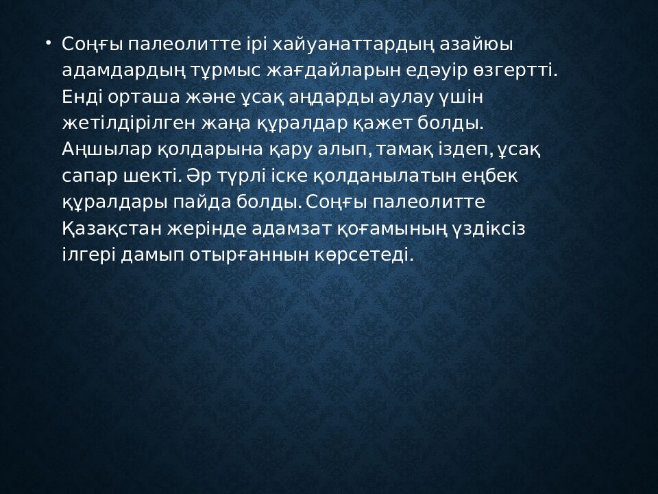 Соңғы палеолитте ірі хайуанаттардың азайюы адамдардың тұрмыс жағдайларын едәуір өзгертті. Енді орташа және ұсақ аңдарды аулау үшін жетілдірілген жаңа құралдар қажет болды. Аңшылар қолдарына қару алып, тамақ іздеп, ұсақ сапар шекті. Әр түрлі іске қолданылатын еңбек құралдары пайда болды. Соңғы палеолитте Қазақстан жерінде адамзат қоғамының үздіксіз ілгері дамып отырғаннын көрсетеді.