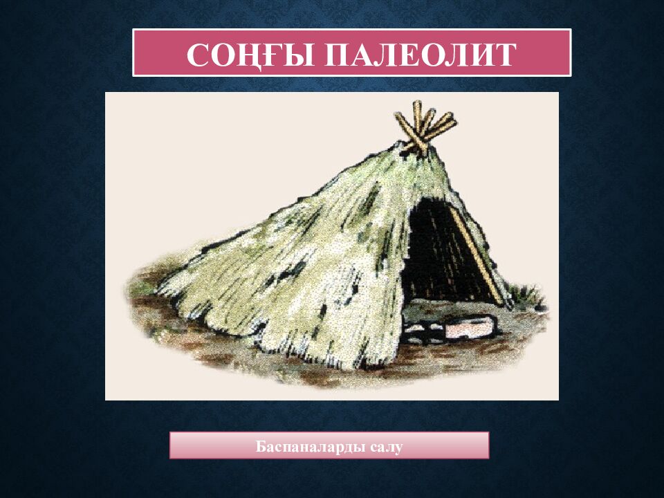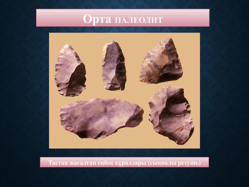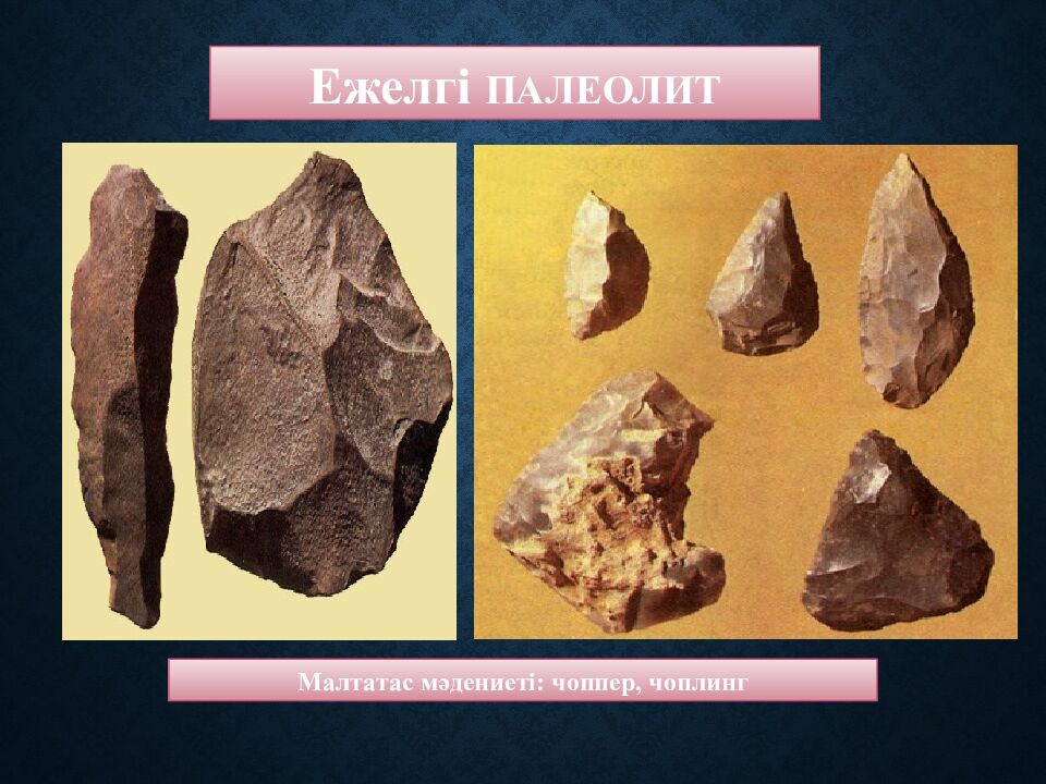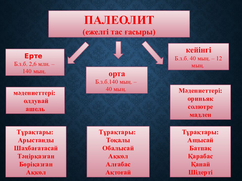ПАЛЕОЛИТ (древний каменный век) ПАЛЕОЛИТ ( ежелгі тас ғасыры ) кейінгі Б.з.б. 40 мың. – 12 мың. Ерте Б.з.б. 2,6 млн. – 140 мың. мәдениеттері: олдувай ашель Мәдениеттері: ориньяк солютре мадлен Тұрақтары: Арыстанды Шахбағатасай Тәңірқазған Бөріқазған Ақкөл Тұрақтары: Ащысай Батпақ Қарабас Қанай Шідерті орта Б.з.б.140 мың. – 40 мың. Тұрақтары: Тоқалы Обалысай Ақкөл Алғабас Ақтоғай