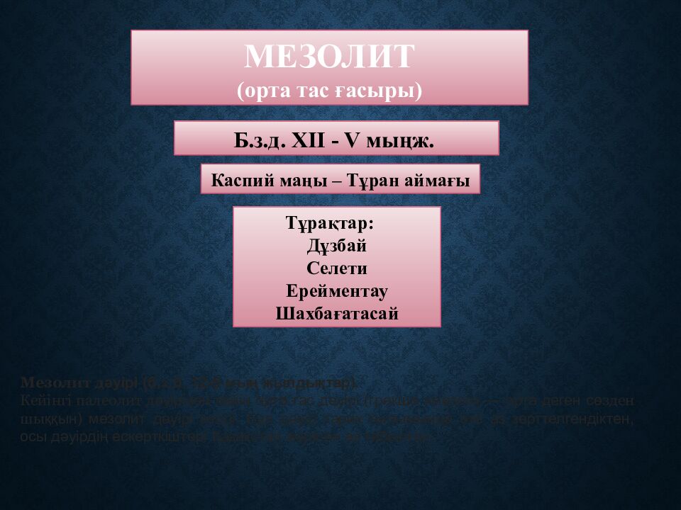 ПАЛЕОЛИТ (древний каменный век) МЕЗОЛИТ (орта тас ғасыры ) Б.з.д. Х II - V мыңж. Каспий маңы – Тұран аймағы Тұрақтар: Дұзбай Селети Ерейментау Шахбағатасай Мезолит д ә уірі ( б.з.б. 12-5 мы ң жылды қ тар ). Кейінгі палеолит д ә уірінен кейін орта тас д ә уірі ( грекше « мезос » — орта деген с ө зден шы ққ ын ) мезолит д ә уірі келді. Б ұ л д ә уір тарих ғ ылымында ө те аз зерттелгендіктен, осы д ә уірді ң ескерткіштері Қ аза қ стан жерінен аз табыл ғ ан.