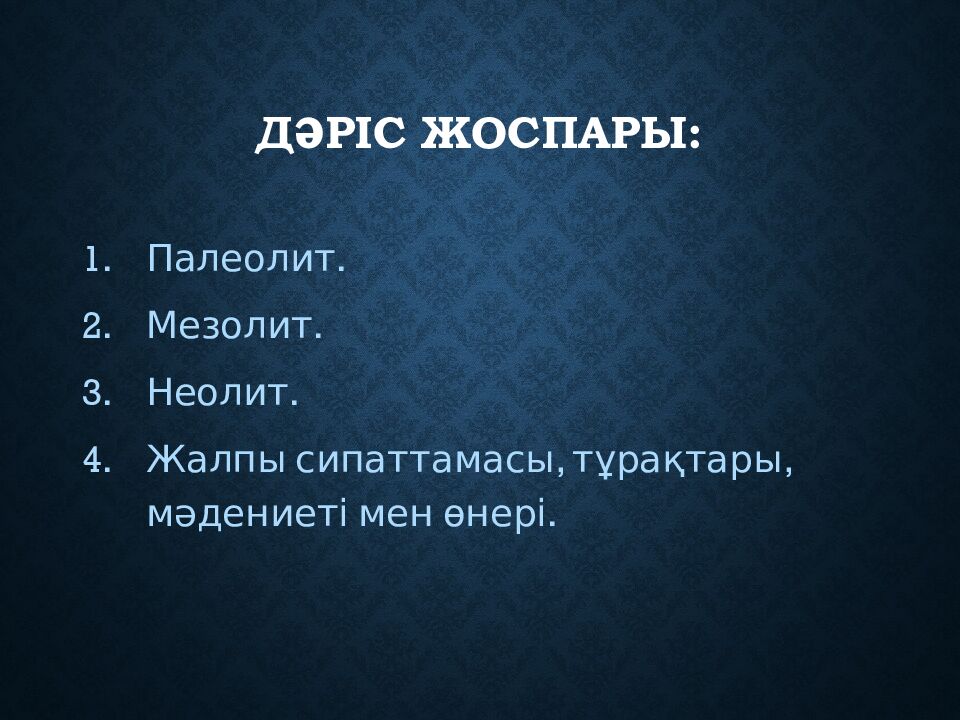 Палеолит. Мезолит. Неолит. Жалпы сипаттамасы, тұрақтары, мәдениеті мен өнері.