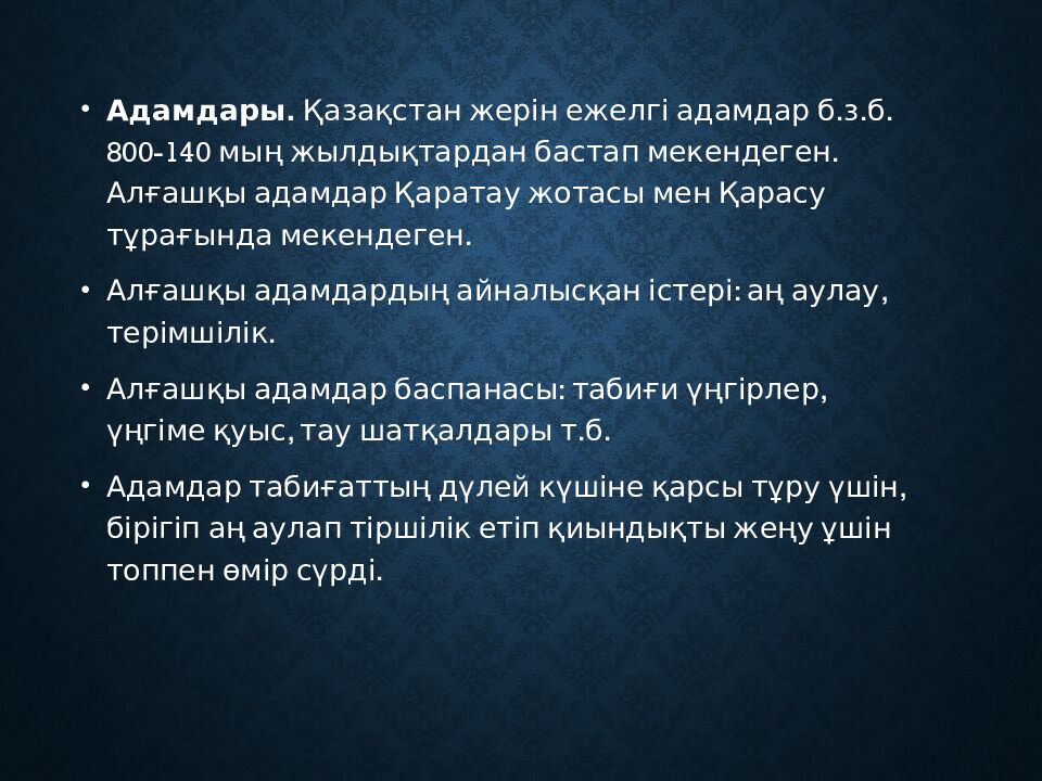 Адамдары. Қазақстан жерін ежелгі адамдар б.з.б. 800-140 мың жылдықтардан бастап мекендеген. Алғашқы адамдар Қаратау жотасы мен Қарасу тұрағында мекендеген. Алғашқы адамдардың айналысқан істері : аң аулау, терімшілік. Алғашқы адамдар баспанасы : табиғи үңгірлер, үңгіме қуыс, тау шатқалдары т.б. Адамдар табиғаттың дүлей күшіне қарсы тұру үшін, бірігіп аң аулап тіршілік етіп қиындықты жеңу ұшін топпен өмір сүрді.