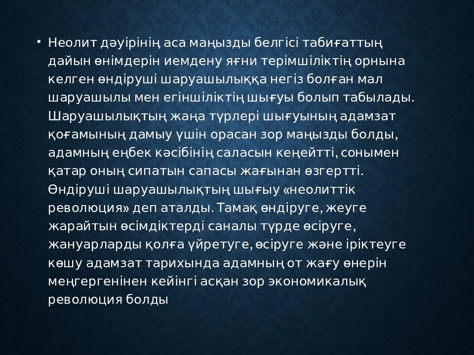 Неолит дәуірінің аса маңызды белгісі табиғаттың дайын өнімдерін иемдену яғни терімшіліктің орнына келген өндіруші шаруашылыққа негіз болған мал шаруашылы мен егіншіліктің шығуы болып табылады. Шаруашылықтың жаңа түрлері шығуының адамзат қоғамының дамыу үшін орасан зор маңызды болды, адамның еңбек кәсібінің саласын кеңейтті, сонымен қатар оның сипатын сапасы жағынан өзгертті. Өндіруші шаруашылықтың шығыу « неолиттік революция» деп аталды. Тамақ өндіруге, жеуге жарайтын өсімдіктерді саналы түрде өсіруге, жануарларды қолға үйретуге, өсіруге және іріктеуге көшу адамзат тарихында адамның от жағу өнерін меңгергенінен кейінгі асқан зор экономикалық революция болды