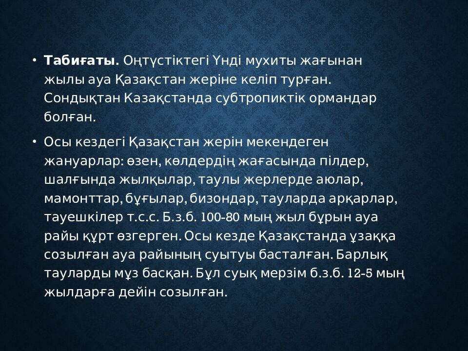 Табиғаты. Оңтүстіктегі Үнді мухиты жағынан жылы ауа Қазақстан жеріне келіп турған. Сондықтан Казақстанда субтропиктік ормандар болған. Осы кездегі Қазақстан жерін мекендеген жануарлар : өзен, көлдердің жағасында пілдер, шалғында жылқылар, таулы жерлерде аюлар, мамонттар, бұғылар, бизондар, тауларда арқарлар, тауешкілер т.с.с. Б.з.б. 100-80 мың жыл бұрын ауа райы құрт өзгерген. Осы кезде Қазақстанда ұзаққа созылған ауа райының суытуы басталған. Барлық тауларды мұз басқан. Бұл суық мерзім б.з.б. 12-5 мың жылдарға дейін созылған.