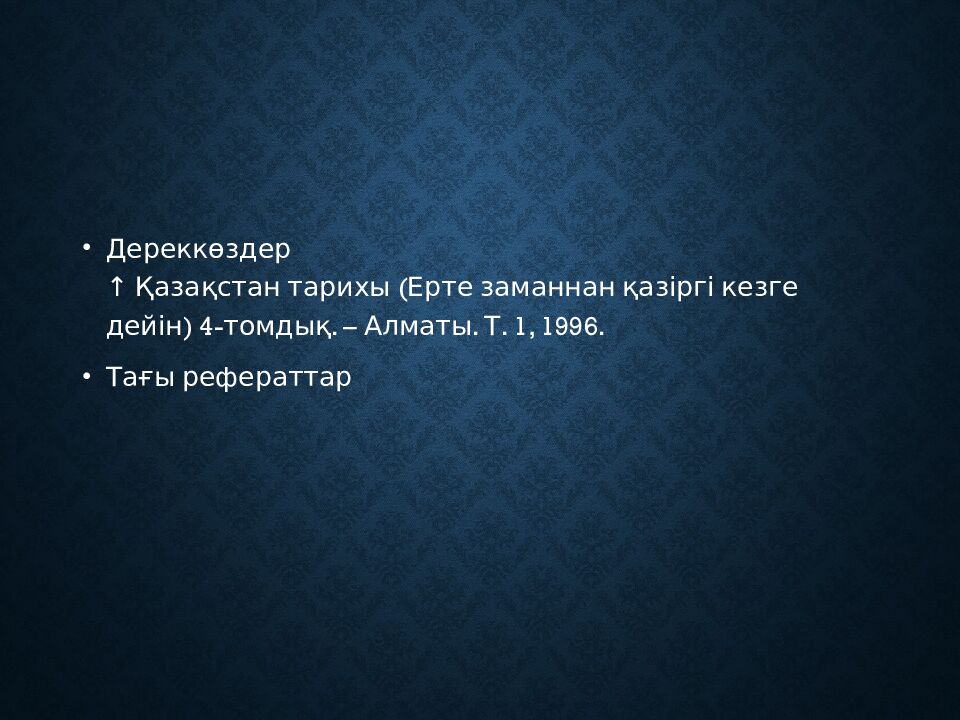 Дереккөздер ↑ Қазақстан тарихы ( Ерте заманнан қазіргі кезге дейін ) 4-томдық. – Алматы. Т. 1, 1996. Тағы рефераттар