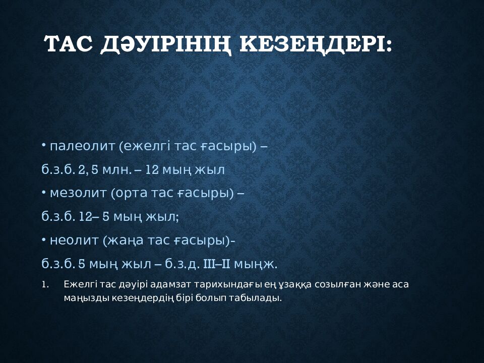 палеолит ( ежелгі тас ғасыры ) – б.з.б. 2, 5 млн. – 12 мың жыл мезолит (орта тас ғасыры ) – б.з.б. 12– 5 мың жыл ; неолит ( жаңа тас ғасыры )- б.з.б. 5 мың жыл – б.з.д. III – II мыңж. Ежелгі тас дәуірі адамзат тарихындағы ең ұзаққа созылған және аса маңызды кезеңдердің бірі болып табылады.