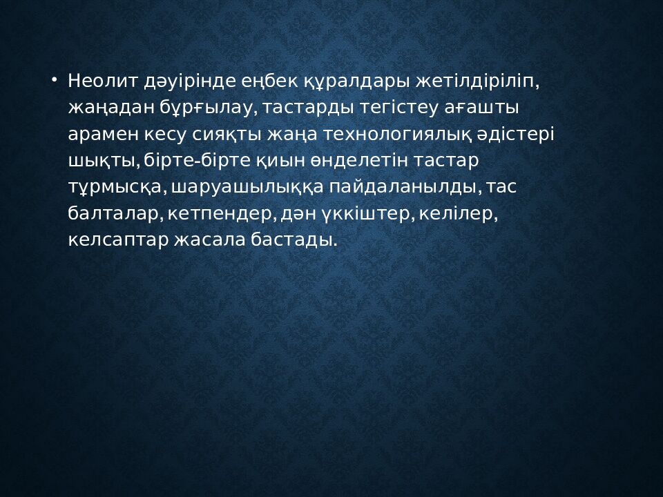 Неолит дәуірінде еңбек құралдары жетілдіріліп, жаңадан бұрғылау, тастарды тегістеу ағашты арамен кесу сияқты жаңа технологиялық әдістері шықты, бірте-бірте қиын өнделетін тастар тұрмысқа, шаруашылыққа пайдаланылды, тас балталар, кетпендер, дән үккіштер, келілер, келсаптар жасала бастады.