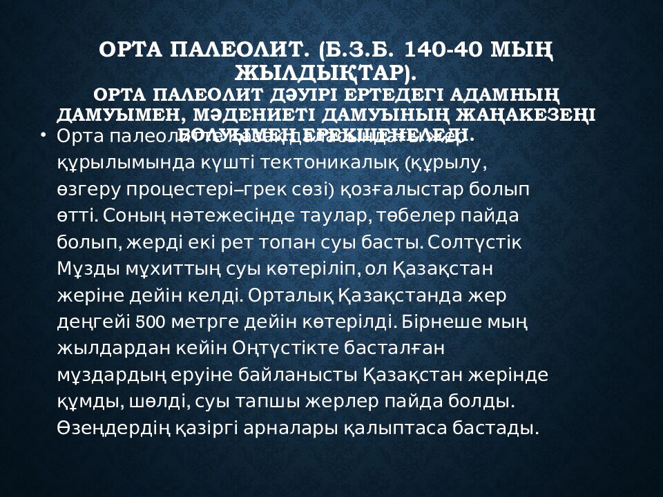 Орта палеолитте Қазақ даласындағы жер құрылымында күшті тектоникалық ( құрылу, өзгеру процестері –грек сөзі ) қозғалыстар болып өтті. Соның нәтежесінде таулар, төбелер пайда болып, жерді екі рет топан суы басты. Солтүстік Мұзды мұхиттың суы көтеріліп, ол Қазақстан жеріне дейін келді. Орталық Қазақстанда жер деңгейі 500 метрге дейін көтерілді. Бірнеше мың жылдардан кейін Оңтүстікте басталған мұздардың еруіне байланысты Қазақстан жерінде құмды, шөлді, суы тапшы жерлер пайда болды. Өзеңдердің қазіргі арналары қалыптаса бастады.
