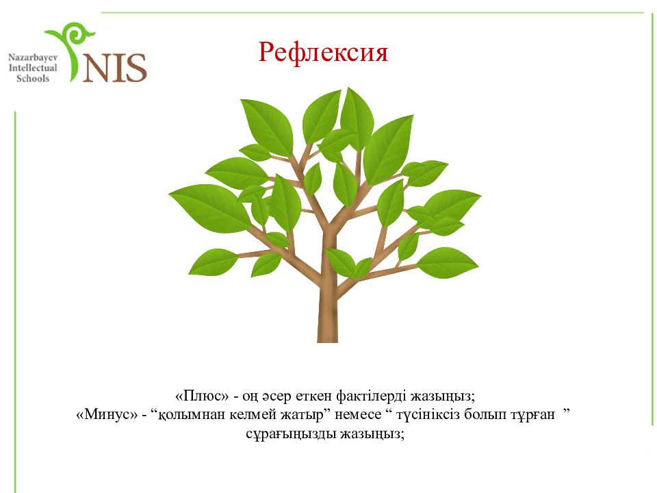 Рефлексия «Плюс» - оң әсер еткен фактілерді жазыңыз ; «Минус» - “ қолымнан келмей жатыр ” немесе “ түсініксіз болып тұрған ” сұрағыңызды жазыңыз ;