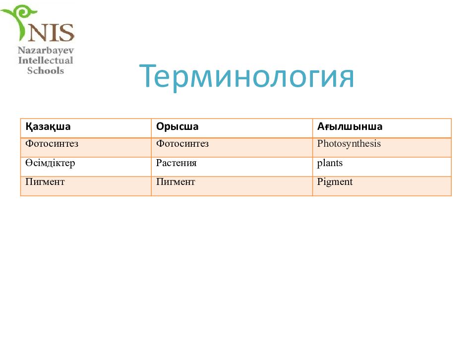 Терминология Қазақша Орысша Ағылшынша Фотосинтез Фотосинтез Photosynthesis Өсімдіктер Растения plants Пигмент Пигмент Pigment