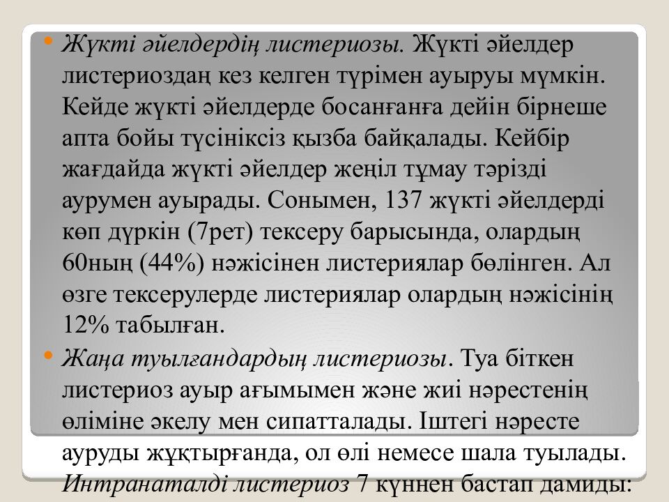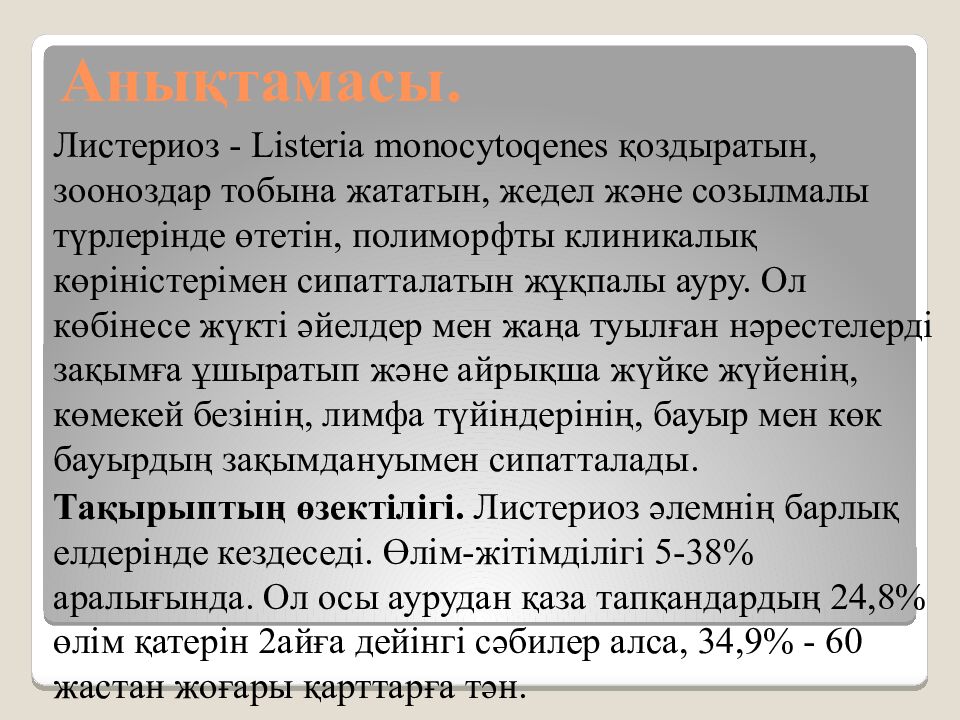 Листериоз - Listeria monocytoqenes қоздыратын, зооноздар тобына жататын, жедел және созылмалы түрлерінде өтетін, полиморфты клиникалық көріністерімен сипатталатын жұқпалы ауру. Ол көбінесе жүкті әйелдер мен жаңа туылған нәрестелерді зақымға ұшыратып және айрықша жүйке жүйенің, көмекей безінің, лимфа түйіндерінің, бауыр мен көк бауырдың зақымдануымен сипатталады. Тақырыптың өзектілігі. Листериоз әлемнің барлық елдерінде кездеседі. Өлім-жітімділігі 5-38% аралығында. Ол осы аурудан қаза тапқандардың 24,8% өлім қатерін 2айға дейінгі сәбилер алса, 34,9% - 60 жастан жоғары қарттарға тән.