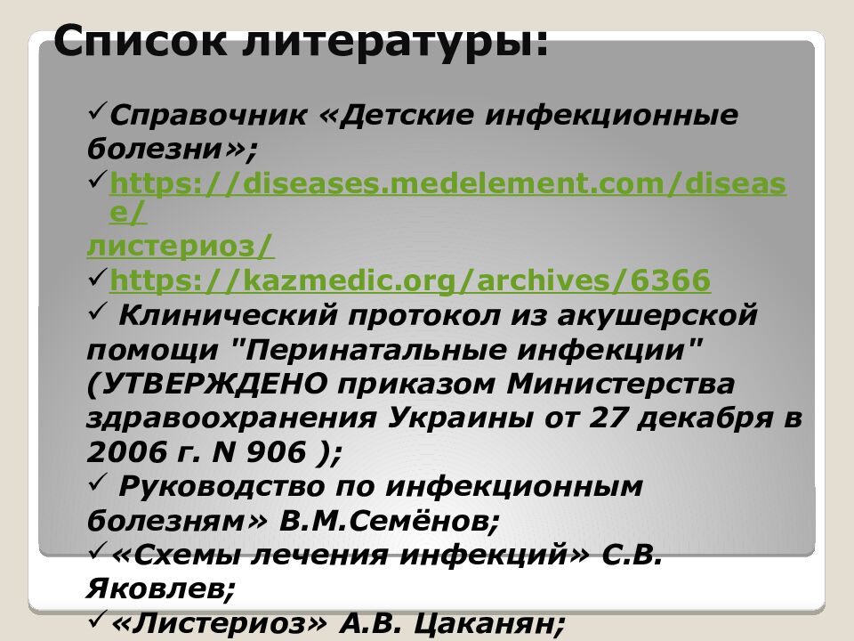 Справочник «Детские инфекционные болезни»; https://diseases.medelement.com/disease/ листериоз / https://kazmedic.org/archives/6366 Клинический протокол из акушерской помощи "Перинатальные инфекции" (УТВЕРЖДЕНО приказом Министерства здравоохранения Украины от 27 декабря в 2006 г. N 906 ); Руководство по инфекционным болезням» В.М.Семёнов ; «Схемы лечения инфекций» С.В. Яковлев; « Листериоз » А.В. Цаканян ; «Проблема листериоза в Украине» ВолянскийЮ.Л. С. Е. Мельникова ЛИСТЕРИОЗ И БЕРЕМЕННОСТЬ