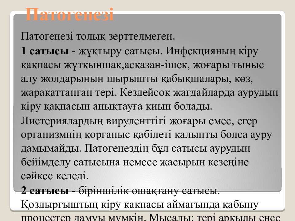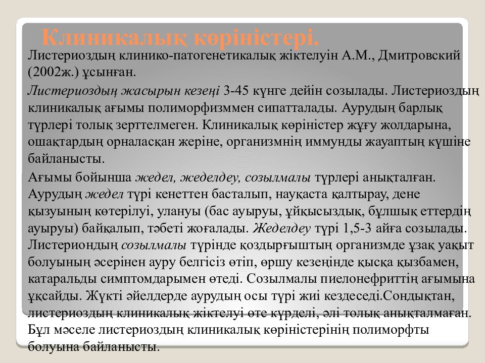 Листериоздың клинико- патогенетикалық жіктелуін А.М., Дмитровский (2002ж.) ұсынған. Листериоздың жасырын кезеңі 3-45 күнге дейін созылады. Листериоздың клиникалық ағымы полиморфизммен сипатталады. Аурудың барлық түрлері толық зерттелмеген. Клиникалық көріністер жұғу жолдарына, ошақтардың орналасқан жеріне, организмнің иммунды жауаптың күшіне байланысты. Ағымы бойынша жедел, жеделдеу, созылмалы түрлері анықталған. Аурудың жедел түрі кенеттен басталып, науқаста қалтырау, дене қызуының көтерілуі, улануы (бас ауыруы, ұйқысыздық, бұлшық еттердің ауыруы ) байқалып, тәбеті жоғалады. Жеделдеу түрі 1,5-3 айға созылады. Листериондың созылмалы түрінде қоздырғыштың организмде ұзақ уақыт болуының әсерінен ауру белгісіз өтіп, өршу кезеңінде қысқа қызбамен, катаральды симптомдарымен өтеді. Созылмалы пиелонефриттің ағымына ұқсайды. Жүкті әйелдерде аурудың осы түрі жиі кездеседі.Сондықтан, листериоздың клиникалық жіктелуі өте күрделі, әлі толық анықталмаған. Бұл мәселе листериоздың клиникалық көріністерінің полиморфты болуына байланысты.
