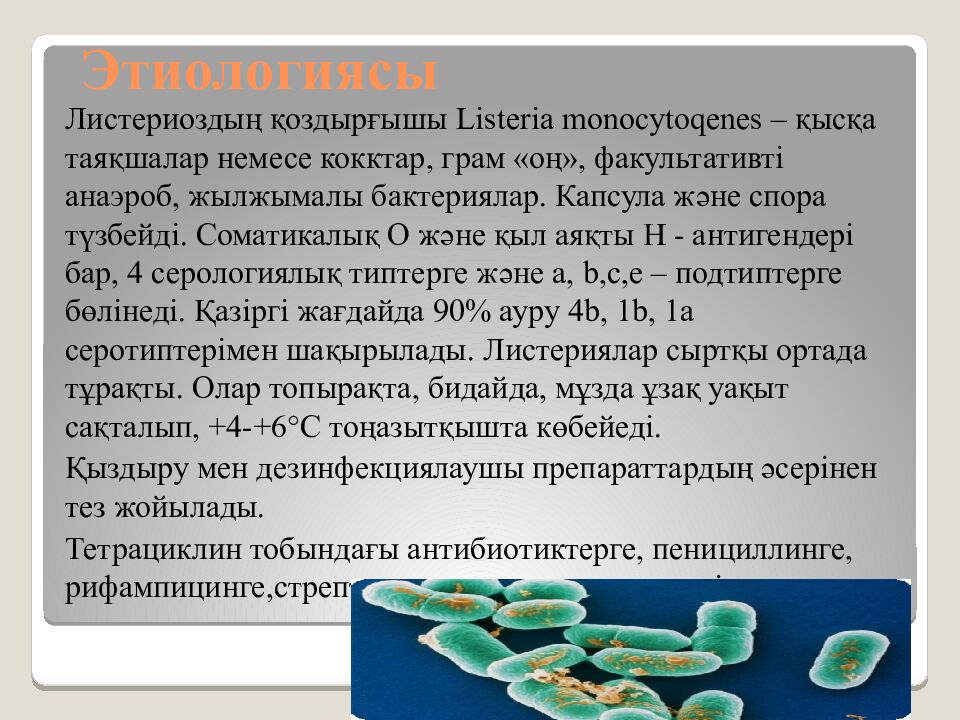 Листериоздың қоздырғышы Listeria monocytoqenes – қысқа таяқшалар немесе кокктар, грам « оң », факультативті анаэроб, жылжымалы бактериялар. Капсула және спора түзбейді. Соматикалық О және қыл аяқты Н - антигендері бар, 4 серологиялық типтерге және а, b, с,e – подтиптерге бөлінеді. Қазіргі жағдайда 90% ауру 4 b, 1b, 1 а серотиптерімен шақырылады. Листериялар сыртқы ортада тұрақты. Олар топырақта, бидайда, мұзда ұзақ уақыт сақталып, +4-+6°С тоңазытқышта көбейеді. Қыздыру мен дезинфекциялаушы препараттардың әсерінен тез жойылады. Тетрациклин тобындағы антибиотиктерге, пенициллинге, рифампицинге,стрептомицин, эритромицин сезімтал.