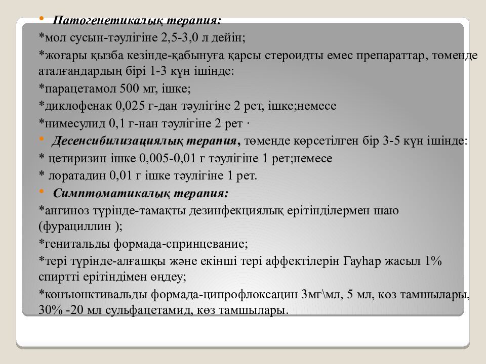 Патогенетикалық терапия: *мол сусын-тәулігіне 2,5-3,0 л дейін ; * жоғары қызба кезінде-қабынуға қарсы стероидты емес препараттар, төменде аталғандардың бірі 1-3 күн ішінде : *парацетамол 500 мг, ішке ; * диклофенак 0,025 г-дан тәулігіне 2 рет, ішке;немесе * нимесулид 0,1 г- нан тәулігіне 2 рет · Десенсибилизациялық терапия, төменде көрсетілген бір 3-5 күн ішінде : * цетиризин ішке 0,005-0,01 г тәулігіне 1 рет;немесе * лоратадин 0,01 г ішке тәулігіне 1 рет. Симптоматикалық терапия : * ангиноз түрінде-тамақты дезинфекциялық ерітінділермен шаю ( фурациллин ); * генитальды формада -спринцевание ; * тері түрінде-алғашқы және екінші тері аффектілерін Гауһар жасыл 1% спиртті ерітіндімен өңдеу ; * конъюнктивальды формада-ципрофлоксацин 3мг\мл, 5 мл, көз тамшылары, 30% -20 мл сульфацетамид, көз тамшылары.
