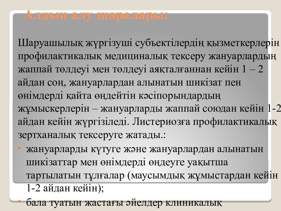 Шаруашылық жүргізуші субъектілердің қызметкерлерін профилактикалық медициналық тексеру жануарлардың жаппай төлдеуі мен төлдеуі аяқталғаннан кейін 1 – 2 айдан соң, жануарлардан алынатын шикізат пен өнімдерді қайта өңдейтін кәсіпорындардың жұмыскерлерін – жануарларды жаппай союдан кейін 1-2 айдан кейін жүргізіледі. Листериозға профилактикалық зертханалық тексеруге жатады.: жануарларды күтуге және жануарлардан алынатын шикізаттар мен өнімдерді өңдеуге уақытша тартылатын тұлғалар ( маусымдық жұмыстардан кейін 1-2 айдан кейін ); бала туатын жастағы әйелдер клиникалық көрсеткіштер бойынша ; ауыр акушерлік анамнезі, жүктіліктің және / немесе босанудың патологиялық ағымы, болжамды листериоз патологиясы бар жүкті және босанушылар ; листериозға күдікті нәрестелер ; көрсеткіштер бойынша өлі туған немесе қайтыс болған балалардың мәйіттері Листериозбен ауыратын адамдармен байланыста болған адамдар, сондай-ақ үй жануарлары листериозға тексеріледі.