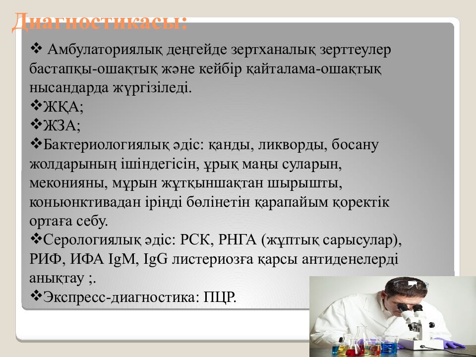 Амбулаториялық деңгейде зертханалық зерттеулер бастапқы-ошақтық және кейбір қайталама-ошақтық нысандарда жүргізіледі. ЖҚА; ЖЗА; Бактериологиялық әдіс : қанды, ликворды, босану жолдарының ішіндегісін, ұрық маңы суларын, меконияны, мұрын жұтқыншақтан шырышты, коньюнктивадан іріңді бөлінетін қарапайым қоректік ортаға себу. Серологиялық әдіс : РСК, РНГА ( жұптық сарысулар ), РИФ, ИФА IgM, IgG листериозға қарсы антиденелерді анықтау ;. Экспресс-диагностика: ПЦР.