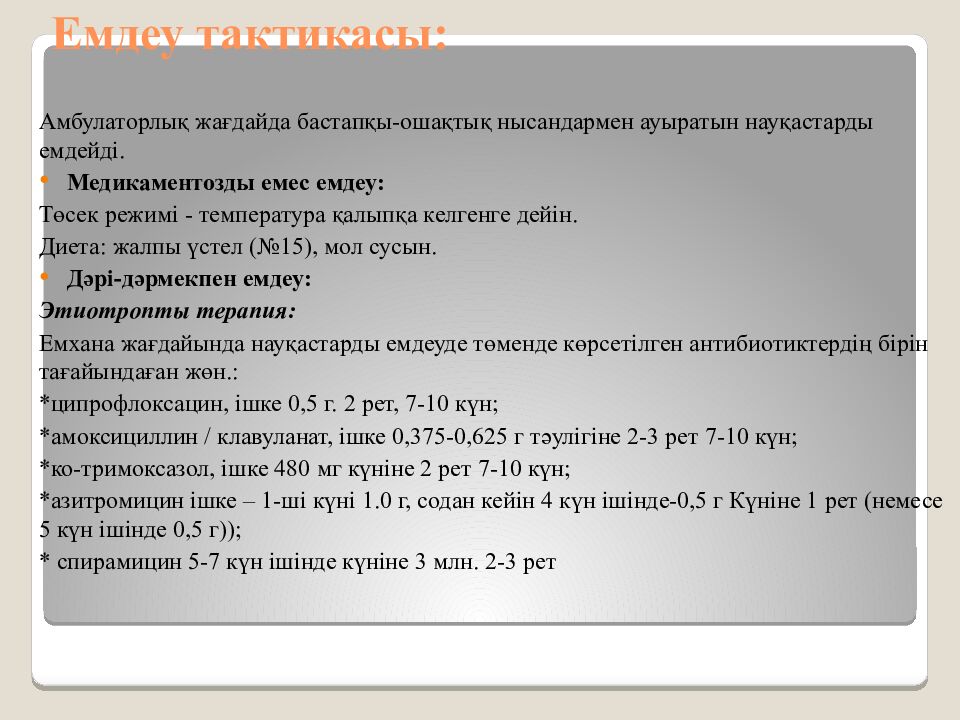 А мбулаторлық жағдайда бастапқы-ошақтық нысандармен ауыратын науқастарды емдейді. Медикаментозды емес емдеу : Төсек режимі - температура қалыпқа келгенге дейін. Диета : жалпы үстел (№15), мол сусын. Дәрі-дәрмекпен емдеу : Этиотропты терапия : Емхана жағдайында науқастарды емдеуде төменде көрсетілген антибиотиктердің бірін тағайындаған жөн.: * ципрофлоксацин, ішке 0,5 г. 2 рет, 7-10 күн ; *амоксициллин / клавуланат, ішке 0,375-0,625 г тәулігіне 2-3 рет 7-10 күн ; *ко- тримоксазол, ішке 480 мг күніне 2 рет 7-10 күн ; * азитромицин ішке – 1-ші күні 1.0 г, содан кейін 4 күн ішінде-0,5 г Күніне 1 рет ( немесе 5 күн ішінде 0,5 г)); * спирамицин 5-7 күн ішінде күніне 3 млн. 2-3 рет