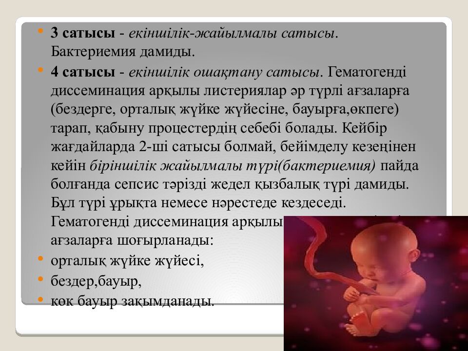 3 сатысы - екіншілік-жайылмалы сатысы. Бактериемия дамиды. 4 сатысы - екіншілік ошақтану сатысы. Гематогенді диссеминация арқылы листериялар әр түрлі ағзаларға ( бездерге, орталық жүйке жүйесіне, бауырға,өкпеге ) тарап, қабыну процестердің себебі болады. Кейбір жағдайларда 2-ші сатысы болмай, бейімделу кезеңінен кейін біріншілік жайылмалы түрі (бактериемия) пайда болғанда сепсис тәрізді жедел қызбалық түрі дамиды. Бұл түрі ұрықта немесе нәрестеде кездеседі. Гематогенді диссеминация арқылы листериялар ішкі ағзаларға шоғырланады : орталық жүйке жүйесі, бездер,бауыр, көк бауыр зақымданады.