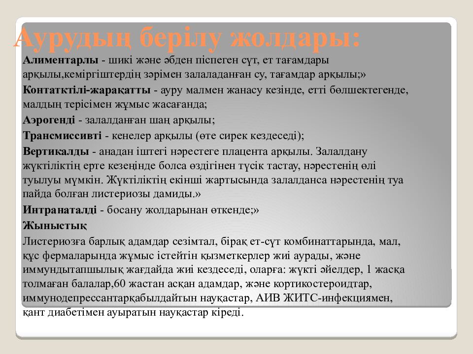 А лиментарлы - шикі және әбден піспеген сүт, ет тағамдары арқылы,кеміргіштердің зәрімен залаладанған су, тағамдар арқылы ;» Контатктілі-жарақатты - ауру малмен жанасу кезінде, етті бөлшектегенде, малдың терісімен жұмыс жасағанда ; А эрогенді - залалданған шаң арқылы ; Т рансмиссивті - кенелер арқылы ( өте сирек кездеседі ); В ертикалды - анадан іштегі нәрестеге плацента арқылы. Залалдану жүктіліктің ерте кезеңінде болса өздігінен түсік тастау, нәрестенің өлі туылуы мүмкін. Жүктіліктің екінші жартысында залалданса нәрестенің туа пайда болған листериозы дамиды.» И нтранаталді - босану жолдарынан өткенде ;» Жыныстық Листериозға барлық адамдар сезімтал, бірақ ет-сүт комбинаттарында, мал, құс фермаларында жұмыс істейтін қызметкерлер жиі аурады, және иммундытапшылық жағдайда жиі кездеседі, оларға : жүкті әйелдер, 1 жасқа толмаған балалар,60 жастан асқан адамдар, және кортикостероидтар, иммунодепрессантарқабылдайтын науқастар, АИВ ЖИТС- инфекциямен, қант диабетімен ауыратын науқастар кіреді.