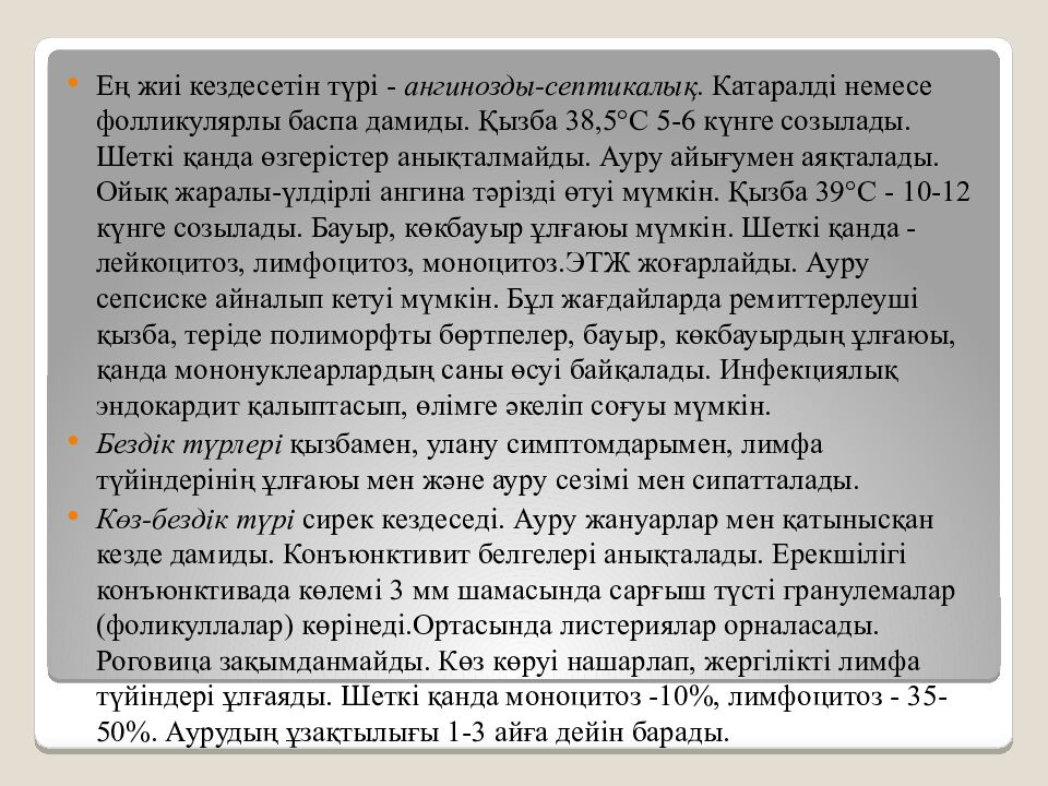 Ең жиі кездесетін түрі - ангинозды-септикалық. Катаралді немесе фолликулярлы баспа дамиды. Қызба 38,5°С 5-6 күнге созылады. Шеткі қанда өзгерістер анықталмайды. Ауру айығумен аяқталады. Ойық жаралы-үлдірлі ангина тәрізді өтуі мүмкін. Қызба 39° C - 10-12 күнге созылады. Бауыр, көкбауыр ұлғаюы мүмкін. Шеткі қанда - лейкоцитоз, лимфоцитоз, моноцитоз.ЭТЖ жоғарлайды. Ауру сепсиске айналып кетуі мүмкін. Бұл жағдайларда ремиттерлеуші қызба, теріде полиморфты бөртпелер, бауыр, көкбауырдың ұлғаюы, қанда мононуклеарлардың саны өсуі байқалады. Инфекциялық эндокардит қалыптасып, өлімге әкеліп соғуы мүмкін. Бездік түрлері қызбамен, улану симптомдарымен, лимфа түйіндерінің ұлғаюы мен және ауру сезімі мен сипатталады. Көз-бездік түрі сирек кездеседі. Ауру жануарлар мен қатынысқан кезде дамиды. Конъюнктивит белгелері анықталады. Ерекшілігі конъюнктивада көлемі 3 мм шамасында сарғыш түсті гранулемалар ( фоликуллалар ) көрінеді.Ортасында листериялар орналасады. Роговица зақымданмайды. Көз көруі нашарлап, жергілікті лимфа түйіндері ұлғаяды. Шеткі қанда моноцитоз -10%, лимфоцитоз - 35-50%. Аурудың ұзақтылығы 1-3 айға дейін барады.