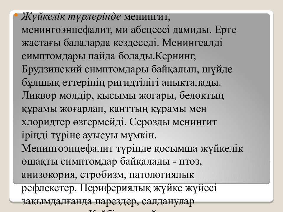 Жүйкелік түрлерінде менингит, менингоэнцефалит, ми абсцессі дамиды. Ерте жастағы балаларда кездеседі. Менингеалді симптомдары пайда болады.Кернинг, Брудзинский симптомдары байқалып, шүйде бұлшық еттерінің ригидтілігі анықталады. Ликвор мөлдір, қысымы жоғары, белоктың құрамы жоғарлап, қанттың құрамы мен хлоридтер өзгермейді. Серозды менингит іріңді түріне ауысуы мүмкін. Менингоэнцефалит түрінде қосымша жүйкелік ошақты симптомдар байқалады - птоз, анизокория, стробизм, патологиялық рефлекстер. Перифериялық жүйке жүйесі зақымдалғанда парездер, салданулар қалыптасады. Кейбір жағдайларда полирадикулоневрит дамиды. Терілік түрі сирек кездеседі. Қоздырғыштың зақымданған тері арқылы енген кезінде дамиды. Алдымен қышитын дақ, одан кейін папула, әріқарай везикула пайда болады. Везикуланың көлемі 2 см дейін үлкейіп жарылады. Листериозды жара қызарған жиегімен қоршалған, ауыру сезімі байқалады. Регионарлы лимфаденит қалыптасады. Орташа дәрежеде улану симптомдары байқалады. Сепсис тәрізді түрі өте ауыр түрде өтеді : жоғары қызбаға, айқын интоксикация белгілеріне, гепатолиеналді синдромға әр түрлі ағзалардың зақымдалуы қосылады - полисерозит, гепатит, перикардит және т. б.