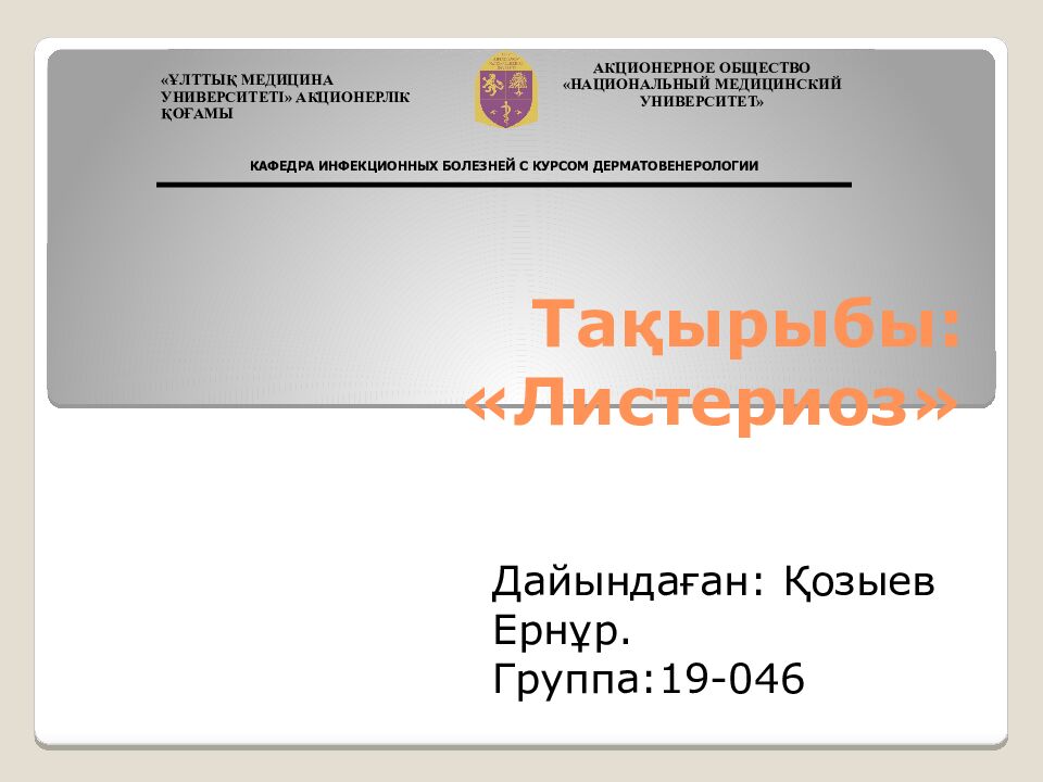 Дайындаған: Қозыев Ернұр. Группа:19-046 «ҰЛТТЫҚ МЕДИЦИНА УНИВЕРСИТЕТІ» АКЦИОНЕРЛІК ҚОҒАМЫ АКЦИОНЕРНОЕ ОБЩЕСТВО «НАЦИОНАЛЬНЫЙ МЕДИЦИНСКИЙ УНИВЕРСИТЕТ» КАФЕДРА ИНФЕКЦИОННЫХ БОЛЕЗНЕЙ С КУРСОМ ДЕРМАТОВЕНЕРОЛОГИИ