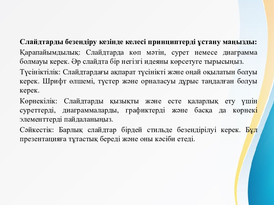 Слайдтарды безендіру кезінде келесі принциптерді ұстану маңызды : Қарапайымдылық : Слайдтарда көп мәтін, сурет немесе диаграмма болмауы керек. Әр слайдта бір негізгі идеяны көрсетуге тырысыңыз. Түсініктілік : Слайдтардағы ақпарат түсінікті және оңай оқылатын болуы керек. Шрифт өлшемі, түстер және орналасуы дұрыс таңдалған болуы керек. Көрнекілік : Слайдтарды қызықты және есте қаларлық ету үшін суреттерді, диаграммаларды, графиктерді және басқа да көрнекі элементтерді пайдаланыңыз. Сәйкестік : Барлық слайдтар бірдей стильде безендірілуі керек. Бұл презентацияға тұтастық береді және оны кәсіби етеді.