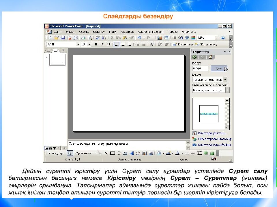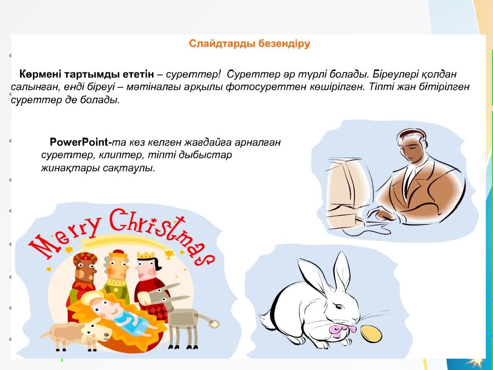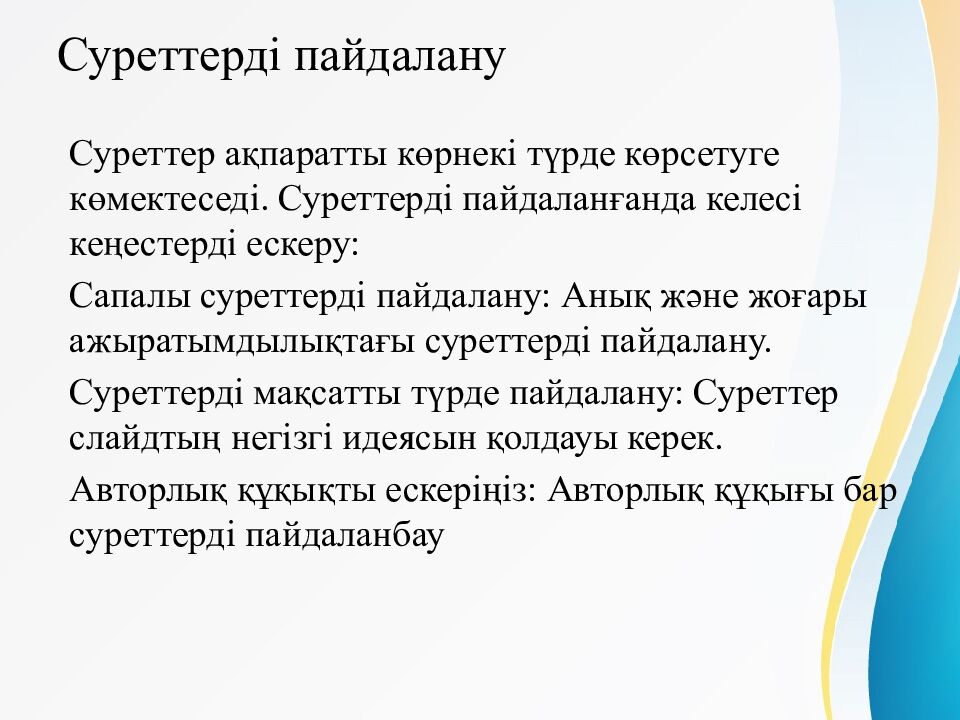 Суреттер ақпаратты көрнекі түрде көрсетуге көмектеседі. Суреттерді пайдаланғанда келесі кеңестерді ескер у : Сапалы суреттерді пайдалан у : Анық және жоғары ажыратымдылықтағы суреттерді пайдалан у. Суреттерді мақсатты түрде пайдалан у : Суреттер слайдтың негізгі идеясын қолдауы керек. Авторлық құқықты ескеріңіз : Авторлық құқығы бар суреттерді пайдаланба у